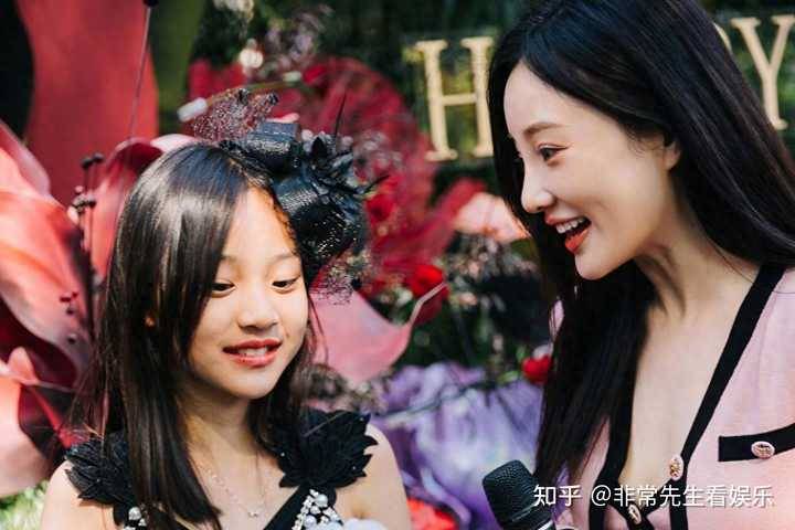 全家福中,甜馨披散著中分長髮,身著黑色紗裙,打扮得像一個黑天鵝,看起來亭亭玉立,與年幼時說「我們白著呢」那古靈精怪的樣子大不相同,繼承了父母外貌的優秀基因。